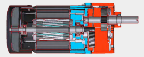 This integral gear motor design eliminates the need for motor and gearhead couplings, it eliminates the risk of possible motor and gearhead misalignment, and it eliminates the guesswork of sizing a motor and gear reducer for the user. The key design feature of a small integral gearmotor is that the motor end shield (blue) at the drive end of the motor is designed to provide a dual function: